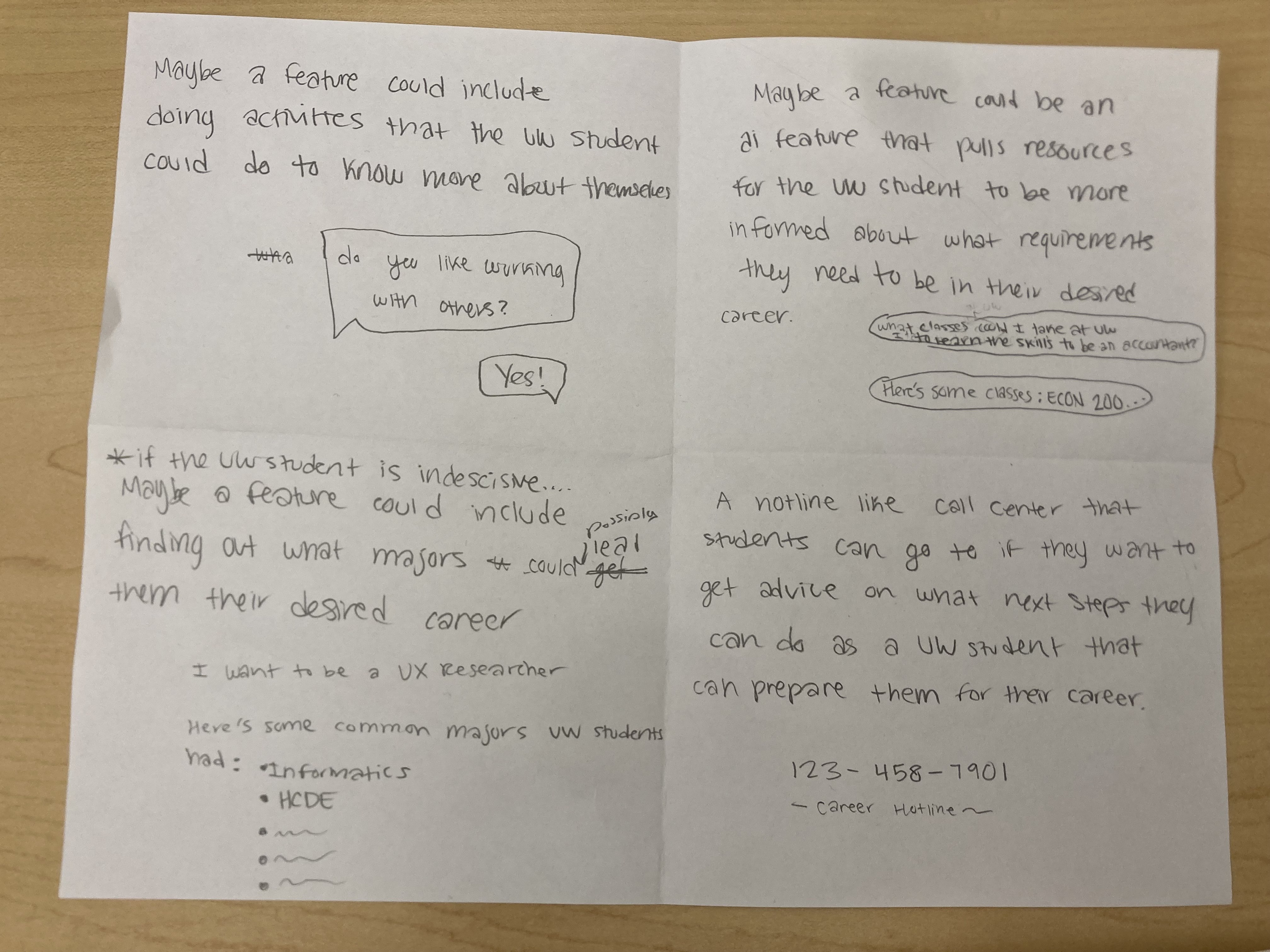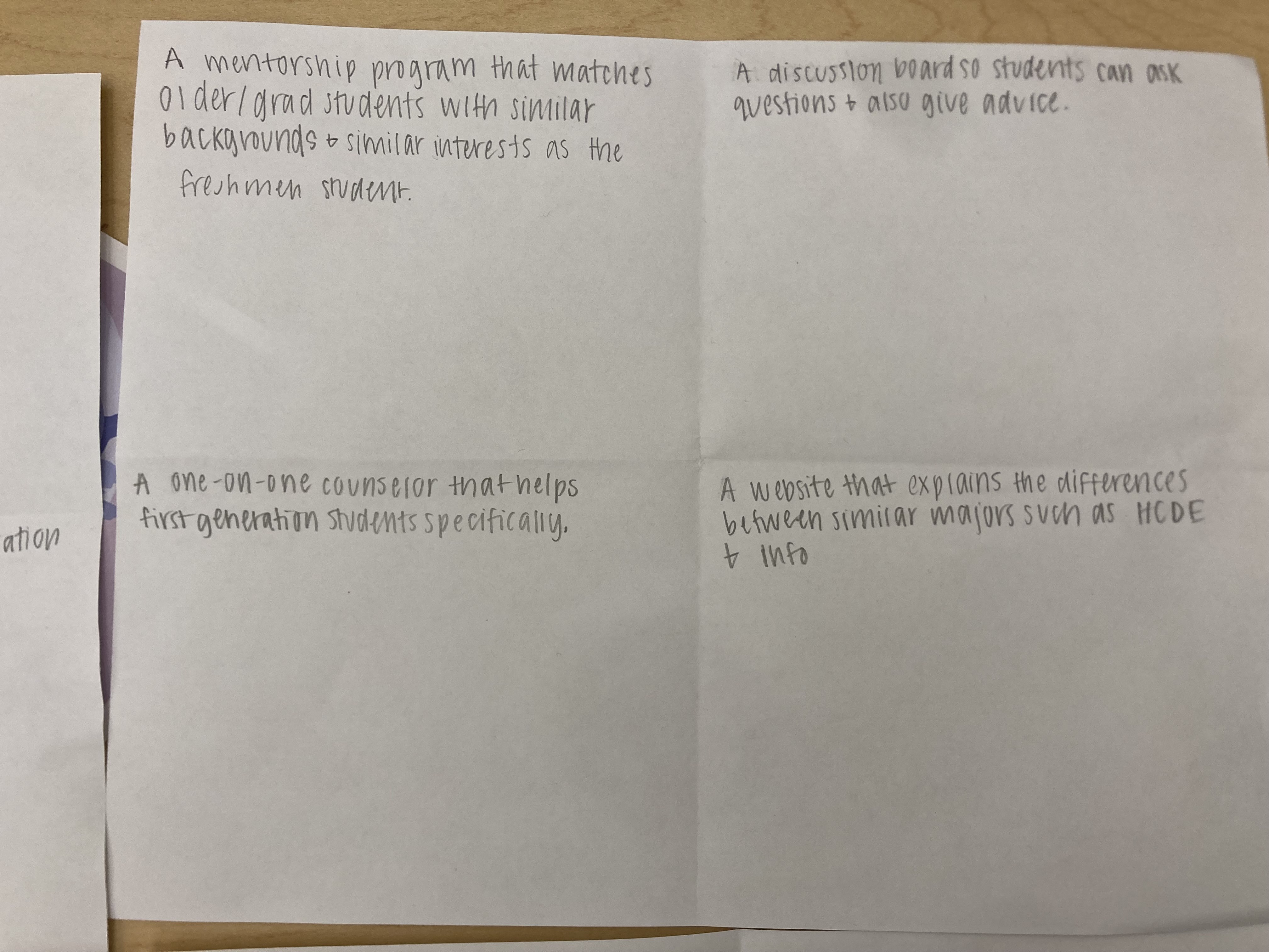 Seek a more diverse group of survey respondents. Our main focus was students at the University of Washington, where our advertisements were primarily focused. This led to user research results revolving only around UW students rather than the general first-generation college student population.