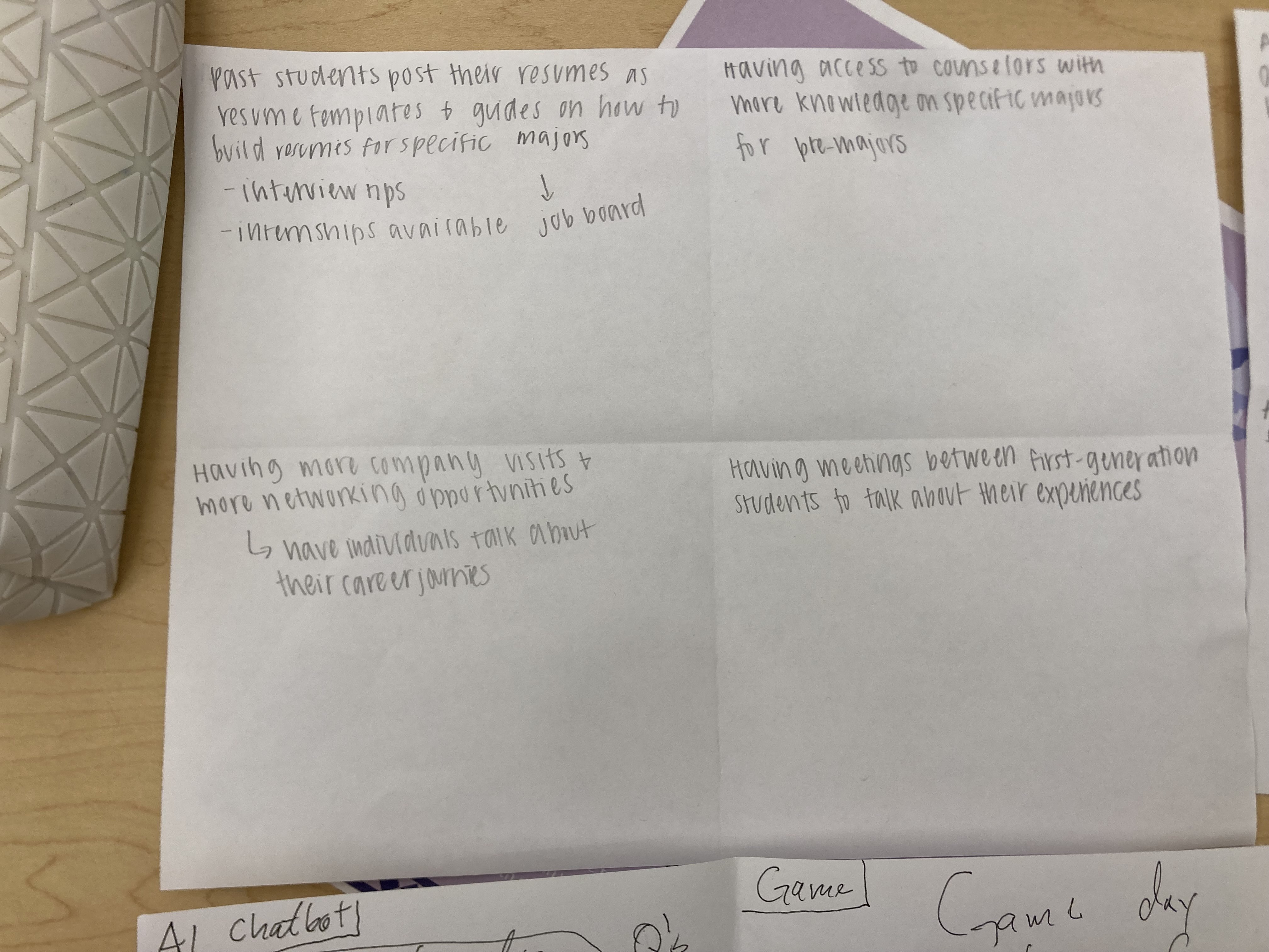 Through our semi-structured interviews, we took away three (3) main insights:1. They aren’t aware of the diverse array of career paths coming into college:Their schools, peers, counselors, and other academic resources pre-college weren’t giving them enough insights and exposure to certain academic and career fields like computer science, consulting, etc., leading to a lack of awareness. 2. Students navigated academic exploration alone without any formal help:They significantly relied on personal research to guide their academic decisions (choosing their majors), highlighting the need for self-driven exploration in the absence of formal or comprehensive guidance.3. Want personalized guidance and mentorship:They want to build a one-on-one connection with someone who they can rely on and guide them through their academic journey. Some have already established that guidance from their cultural community and have found it beneficial in their collegiate development.