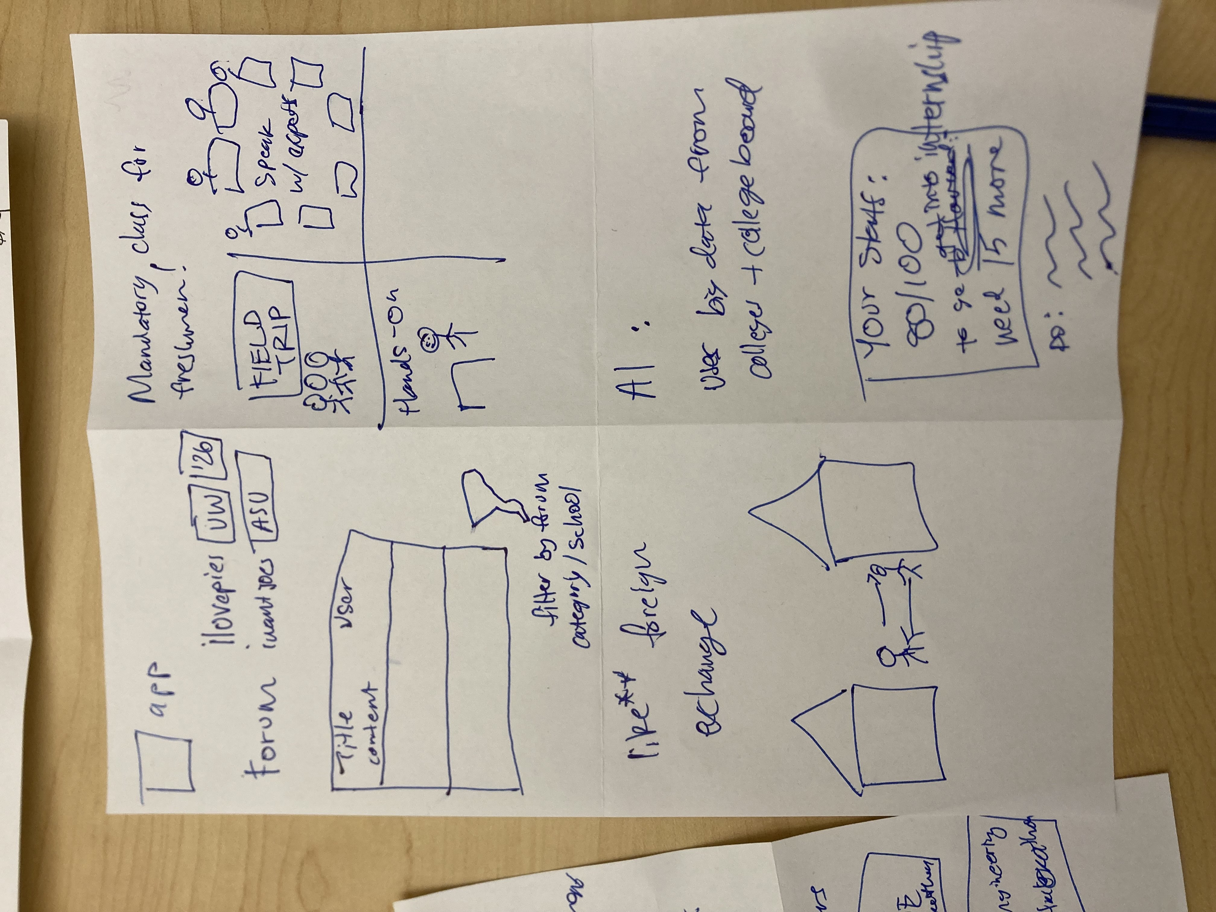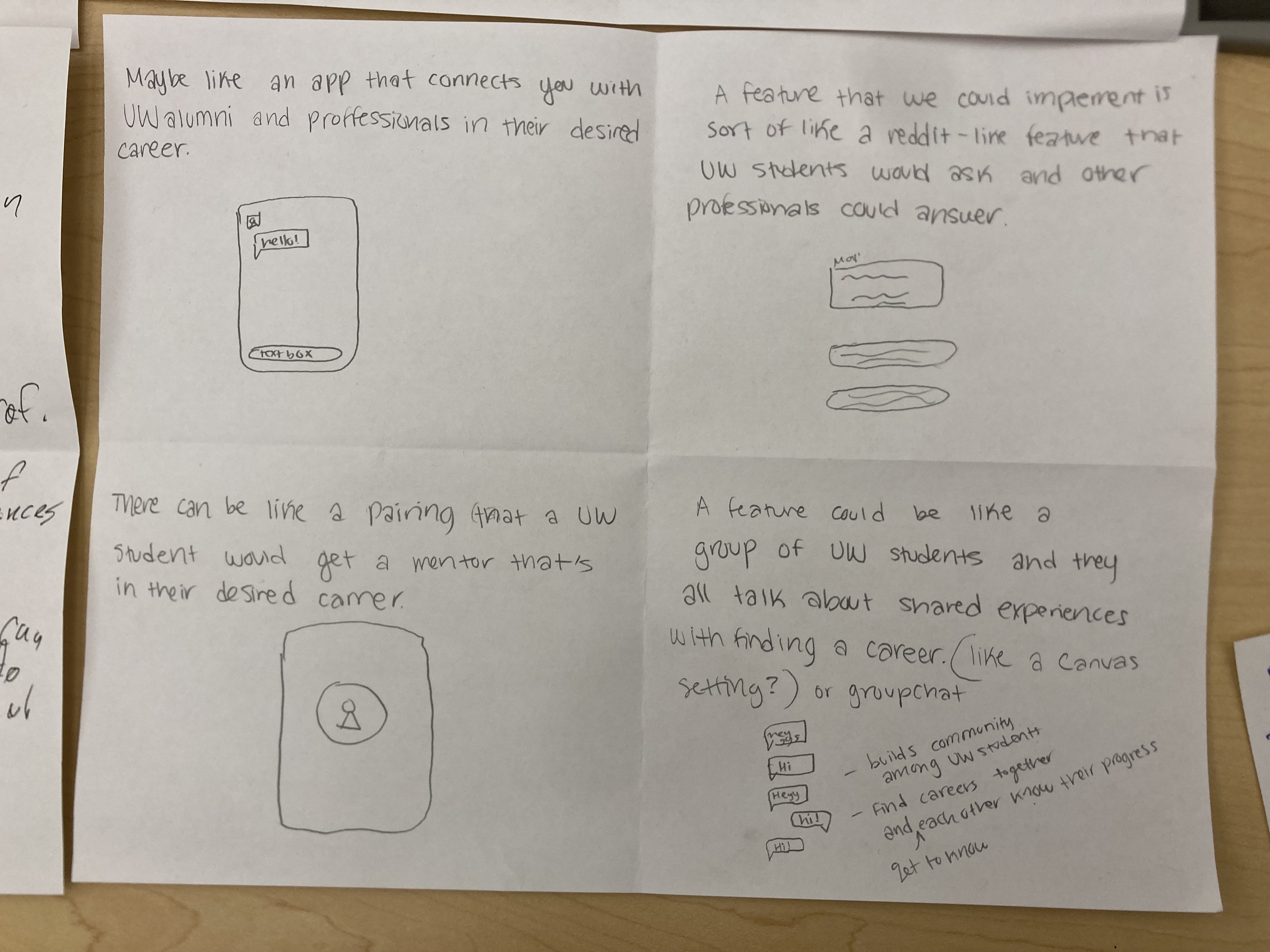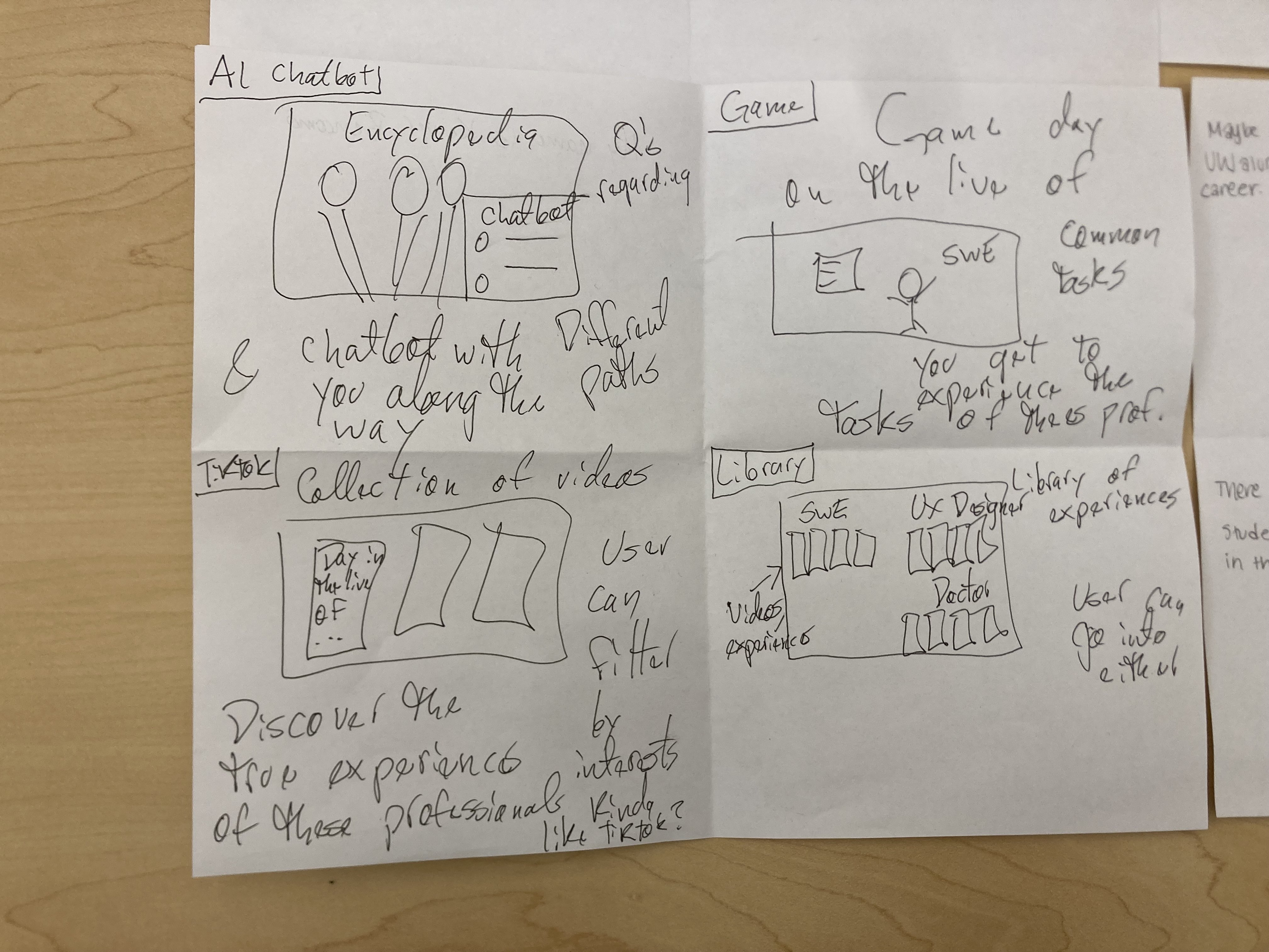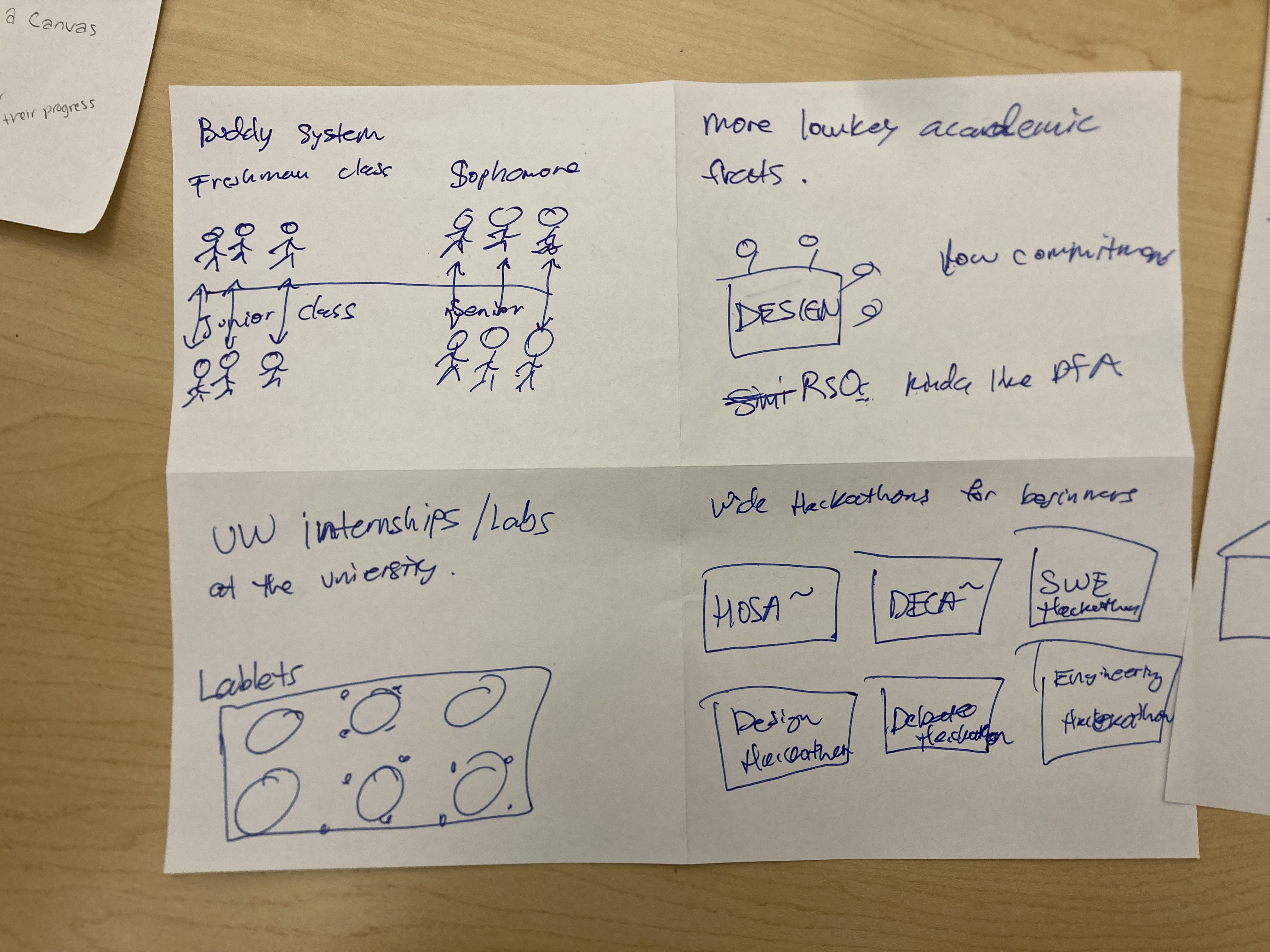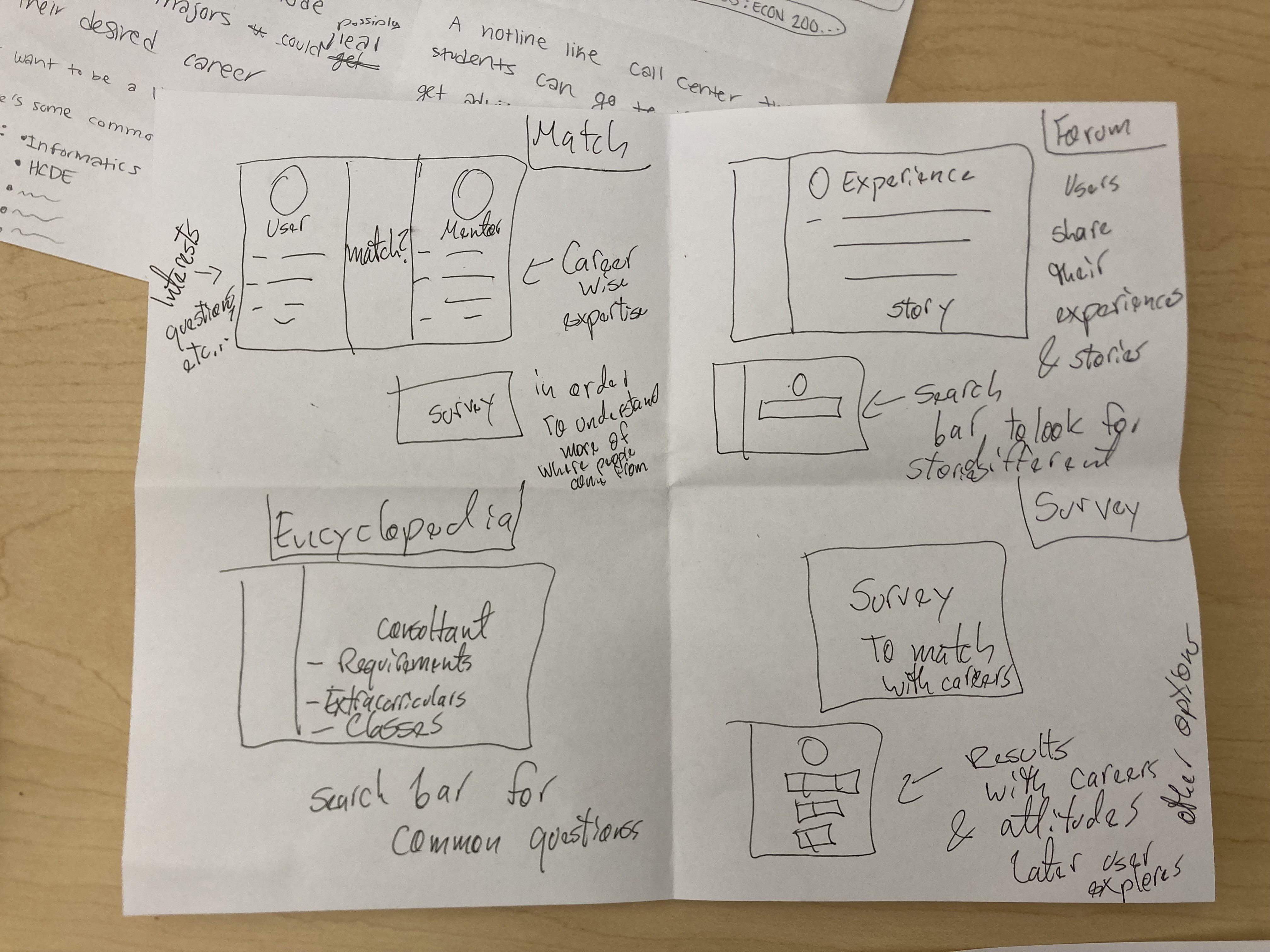 Putting everything in consideration, from the user research to the market research to common themes among our designers, we established our solid idea, combining two prevalent concepts, mentorship and academic events:A web application that provides college students with a personalized and matched mentor and a catalog of relevant academic events to explore and experience their interests.