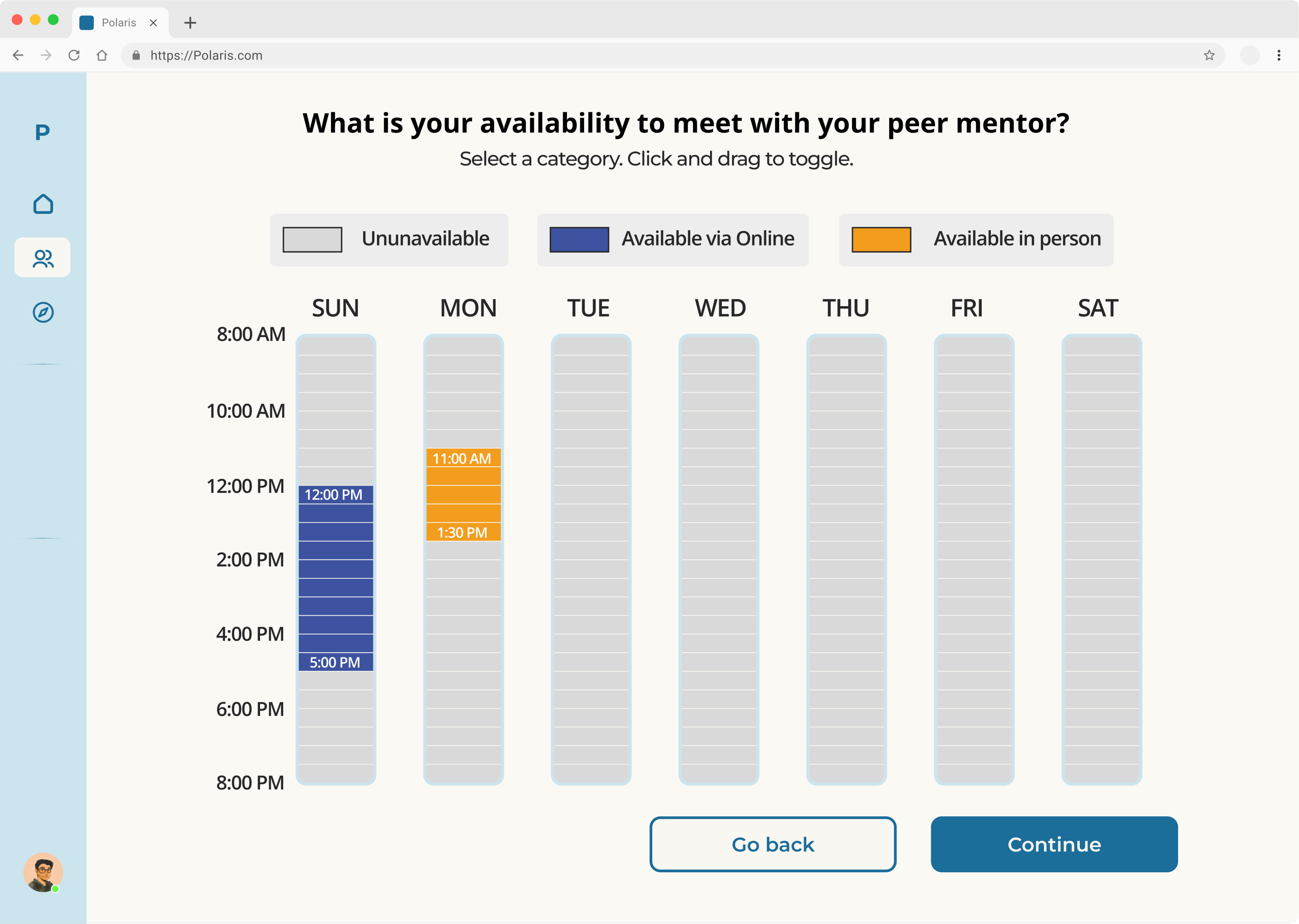A continuance of the mentee questionnaire where users can customize their availability to match with their potential mentors. Users are able to select specific times and dates and specify the location.