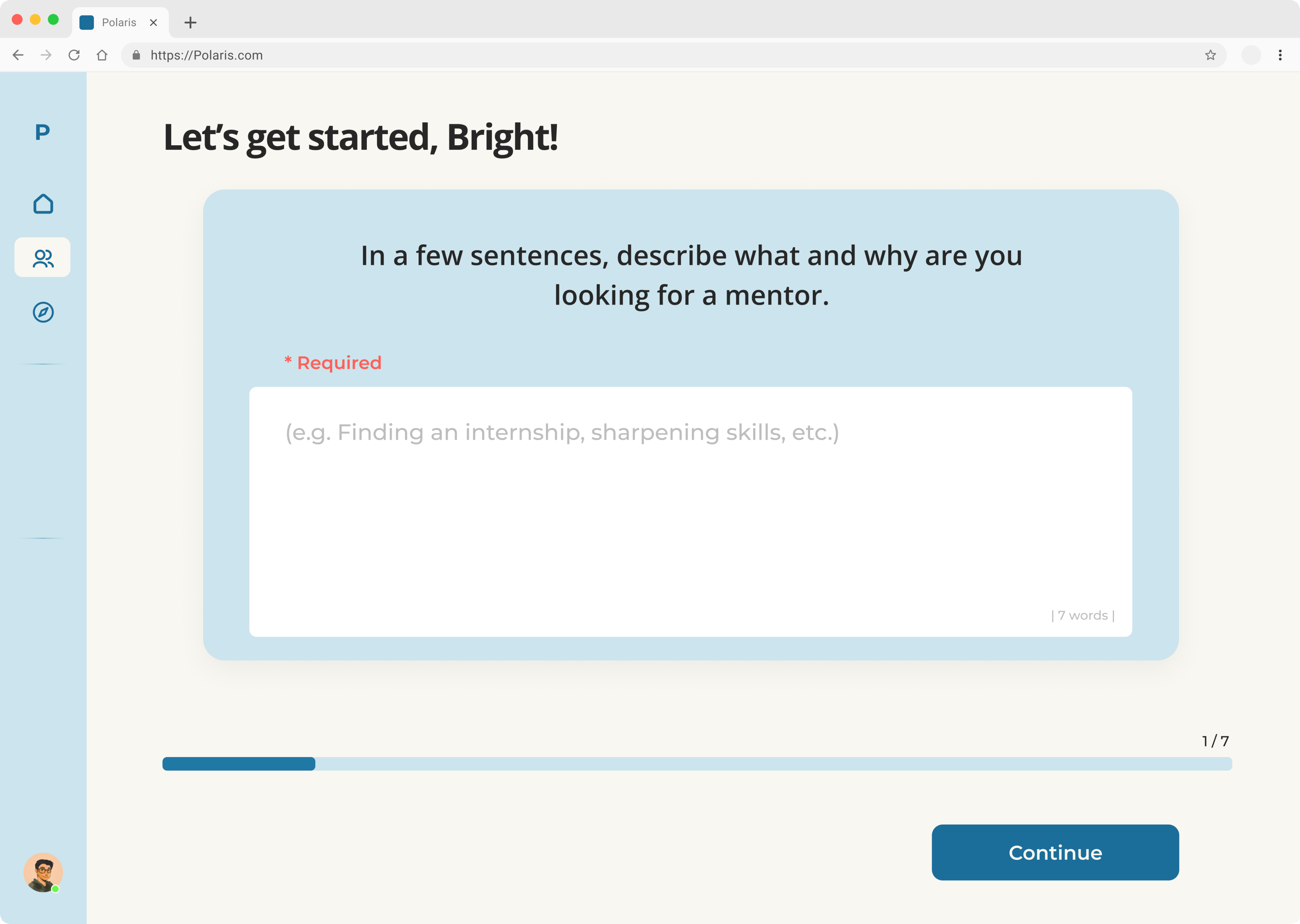 Users (mentees) are taking a questionnaire, specifically meant for the mentorship program. They are giving their backstory on why they want a mentor and other preferences.
