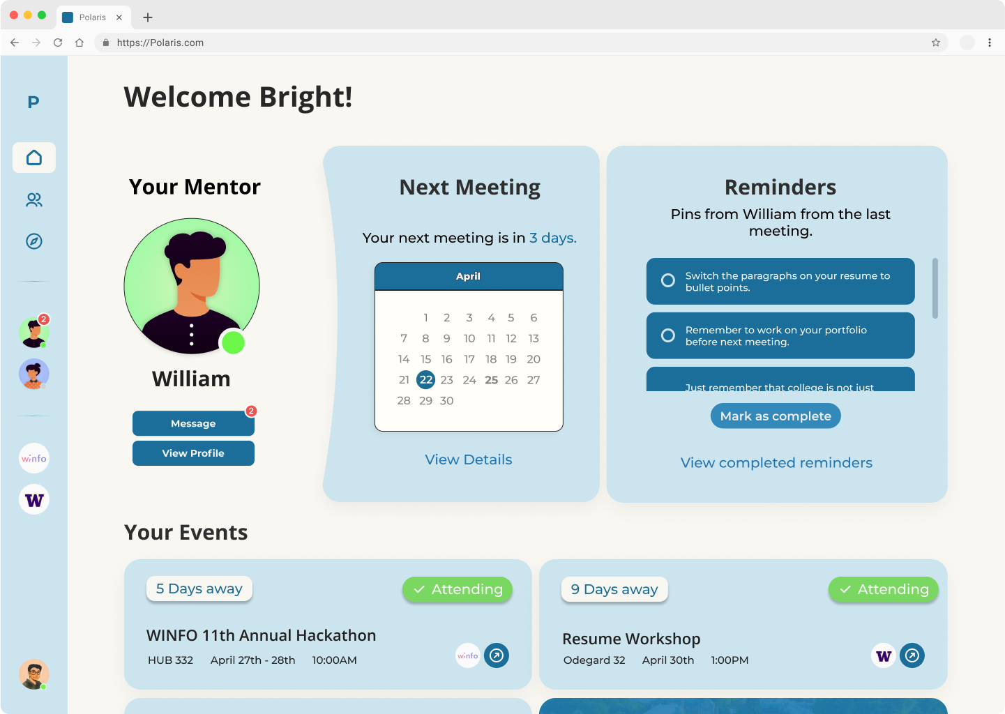 Homepage after users have matched with a mentor. It has a built-in calendar to remind them of upcoming events. It also has a built-in reminders tab to keep up-to-date with tasks.